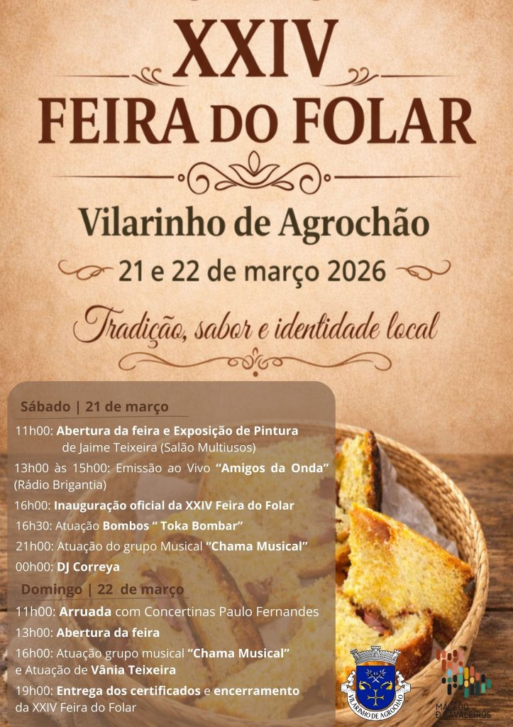A aldeia de Vilarinho de Agrochão, no concelho de Macedo de Cavaleiros, recebe, nos dias 21 e 22 de março de 2026, a XXIV Feira do Folar, um evento dedicado à tradição local e a uma das iguarias mais emblemáticas da região.
